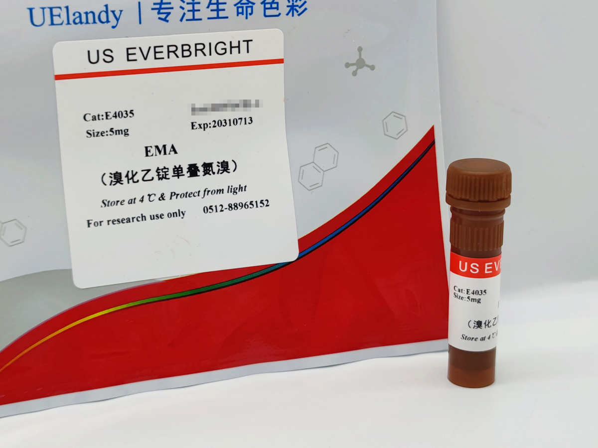 EMA 是一種高親和性的 DNA 結合染料,光解后與 DNA共價結合。該染料已被用于“標記” DNA 上的藥物結合位點、修飾質粒 DNA以及確定造血細胞在細胞周期中的表型、功能和位置。由于EMA不具有細胞膜滲透性,因此在死細胞和活細胞共同存在的情況下,EMA可選擇性地共價結合膜受損的死細胞的 DNA,通過熒光顯微鏡、熒光酶標儀或流式細胞儀進行細胞分析。EMA已被廣泛應用在食品和水安全和環境測試中。