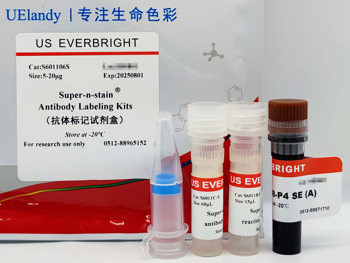 Super-n-stain® 抗體標記試劑盒包含您需要的利用本公司 YF 染料或生物素(Biotin)迅速標記抗體的所有組分。標記過 程只需將抗體和染料簡單混合于試劑盒內提供的反應緩沖溶液中,進行短時間的孵育即可。 Super-n-stain® 染料在標記結束 時不再反應, 因此無需進一步純化步驟。標記后, 約 4-6 分子染料與 1 分子抗體共價結合。 Super-n-stain®是共價標記, 所以用它標記的抗體可以用于多色熒光染色,而不會發生抗體間的染料轉移現象。Super-n-stain® 標記可以兼容 NaN3、低濃度的甘油、 Tris 和甘氨酸。試劑盒里提供的微型超濾離心管可以在標記前快速去除不兼容的小分子抗體穩定劑。